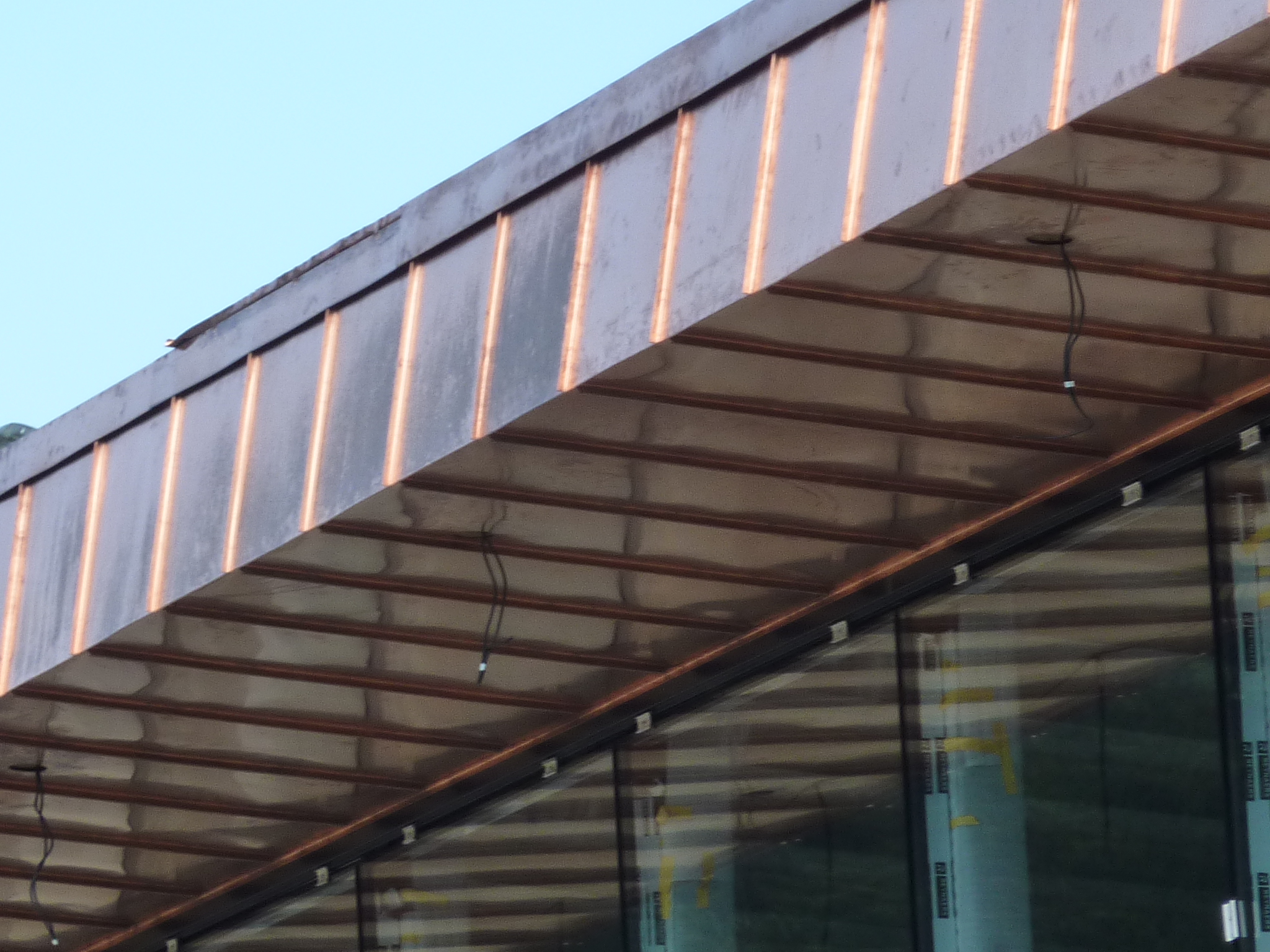 Provedení střešního pláště komplet (mimo prostupujících potrubí vč.jejiích izolací). Provedení východní šikmé stěny (střešního pláště) komplet (bez výplní otvorů, sklobetonu, zábradlí, schodiště)Konstrukce klempířské - Cu plech tl. 0,55 mm, rš. 670 mm. Pod krytinou je umístěna separační folie Delta Trela. Dále tesařské konstrukce.